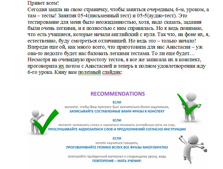 Сегодня зашла на свою страничку, чтобы заняться очередным, 6-м, уроком, а там – тесты! Занятия 05-4(письменный тест) и 05-5(аудио-тест). Это тестирование для меня было неожиданностью, хотя, надо сказать, задания были очень легкими, и я полностью с ним справилась. Но я ведь понимаю, что есть учащиеся, которые начали английский с нуля. Так что, на фоне их, я, естественно, буду смотреться отличницей. Но ведь это – только начало! Впереди еще ой, как много всего, что приготовила для нас Анастасия – уж она-то недолго будет нас баловать легкими тестами. То ли еще будет…