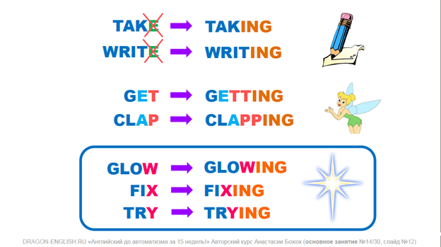 Чтобы создать глагол второго действия необходимо добавить окончание ing,есть некоторые ньюансы при добавлении